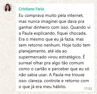 Ela sempre fez compras pela internet sem pensar muito. Depois do curso com a Paula, percebeu que podia transformar o mesmo hábito em estratégia. Hoje tudo que ela compra tem propósito, retorno e faz parte de um novo jeito de usar o dinheiro com consciência.